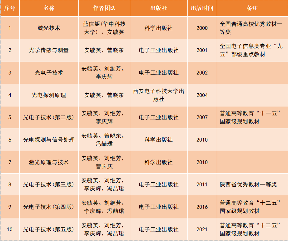 除了《光电子技术》这本教材,多年来,安毓英教授还先后出版了《激光技术》、《光学传感与测量》、《光电探测原理》、《光电探测与信号处理》、《激光原理与技术》等重要教材。