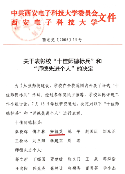 2005年安毓英教授被评为“十佳师德标兵”(金沙娱乐城档案馆馆藏)
