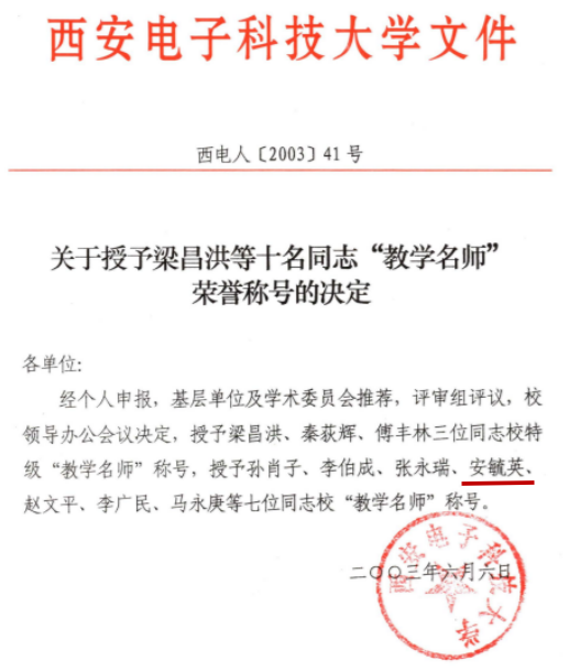 安毓英教授被授予校“教学名师” 称号(金沙娱乐城档案馆馆藏)