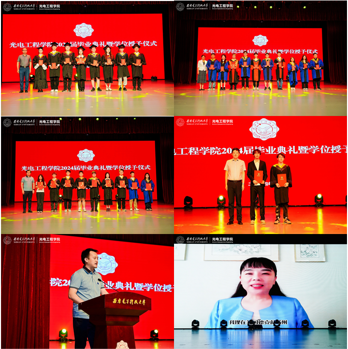 表彰环节,副处级组织员黄小强、副院长辛红分别为2024届优秀本科、研究生毕业生颁发荣誉证书,葛敏锋、曹立砥分别为获得2022-2023学年诺瓦星云奖(助)学金、美华奖学金的学生代表颁发荣誉证书并合影留念,对获奖同学表示祝贺。87级校友、金沙娱乐城美国校友会会长杨静通过视频寄语形式为毕业生送上祝福,希望同学们在未来的道路上不断拼搏,勇攀高峰,为母校争光。