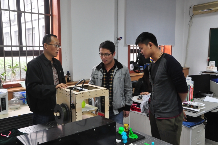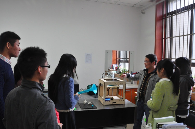 的电子数据库,查阅了大量的国内外文献资料,为3D打印技术做好了坚实的理论支撑。同时关注3D技术的最前沿动态,通过虚心的请教和耐心的试验,研发小组先后攻克十余个技术难关,并不断进行完善改进,终于在2014年的暑假,研制出第一台桌面级3D打印样机。