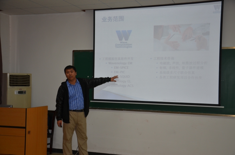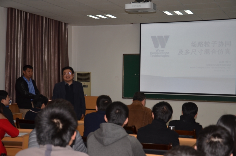 执行院长郭立新教授邀请,美国WCT公司(Wave Computation Technologies, Inc.以开发尖端计算机工程模拟仿真技术为核心业务)副总裁赵博博士在西大楼Ⅲ-405学术报告厅作了题为“场-路-粒子及多尺寸混合仿真技术”的学术报告。郭立新等多位老师及百余名研究生参加了本次报告会。