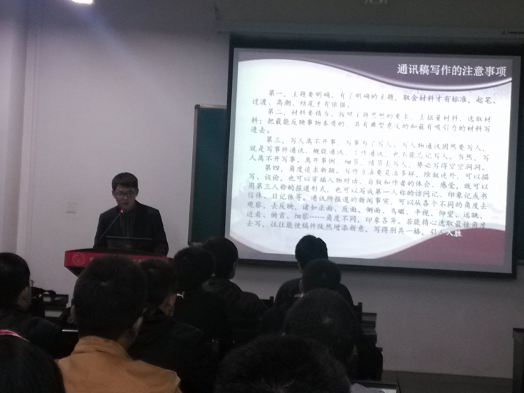 会上,洪邑晖学长针对通讯稿写作做了详细的经验分享,他向大家介绍了通讯稿写作的基本要求、相关知识与注意事项,并对历来易出错的环节进行了详细的阐述。在此基础上,结合鲜活生动的典型实例,对写作角度进行了独特的分析,拓宽了通讯员关于通讯稿写作的多角度知识面,提高了活动报道的理论水平。除此以外,为了使培训更有针对性,洪邑晖学长现场点评历届通讯员写作的稿件,对通讯员在写作过程中出现的问题、困惑进行了解答。在培训结尾,洪邑晖学长与材料金沙娱乐城