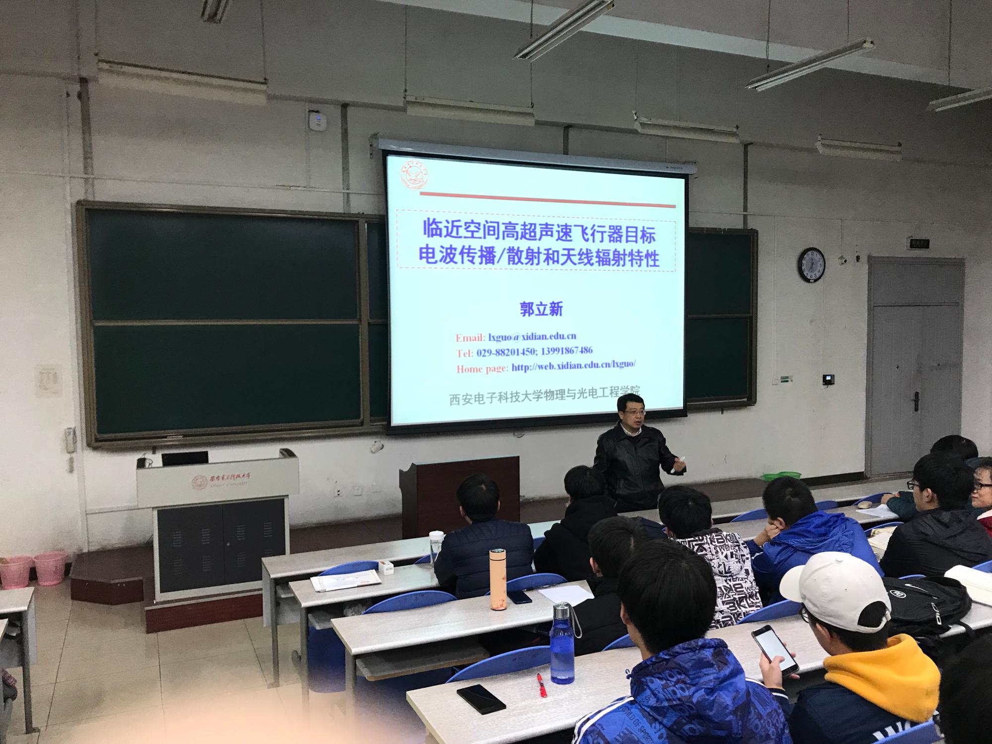 院长、教育部长江学者特聘教授郭立新主讲。郭院长从该项目的重要内容“等离子体鞘套”入手,结合研究进展,为大家生动地展示了其重要意义,让同学们感受到了所学专业对国防事业的重要贡献。