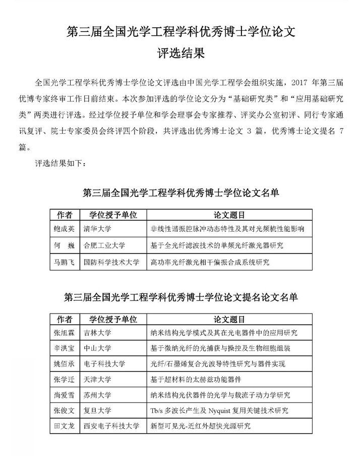 金沙娱乐城 田文龙获得第三届全国光学工程学科优秀博士学位论文提名奖