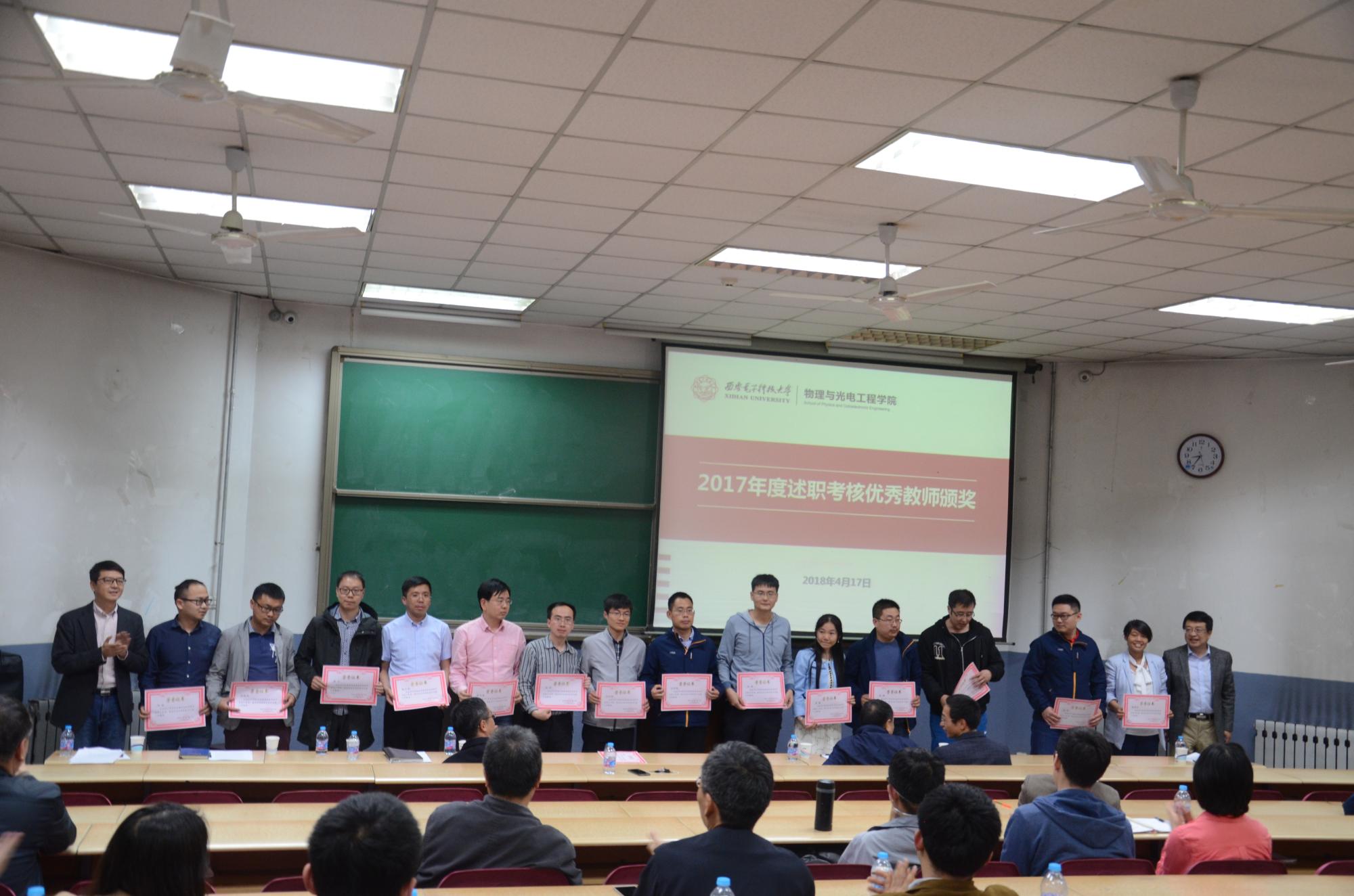 会议根据《关于表彰奖励2017年度述职考核优秀教师的决定》(物光院字[2018]7号)文件,李建东、杨光暐、郭立新等领导分别为金沙娱乐城