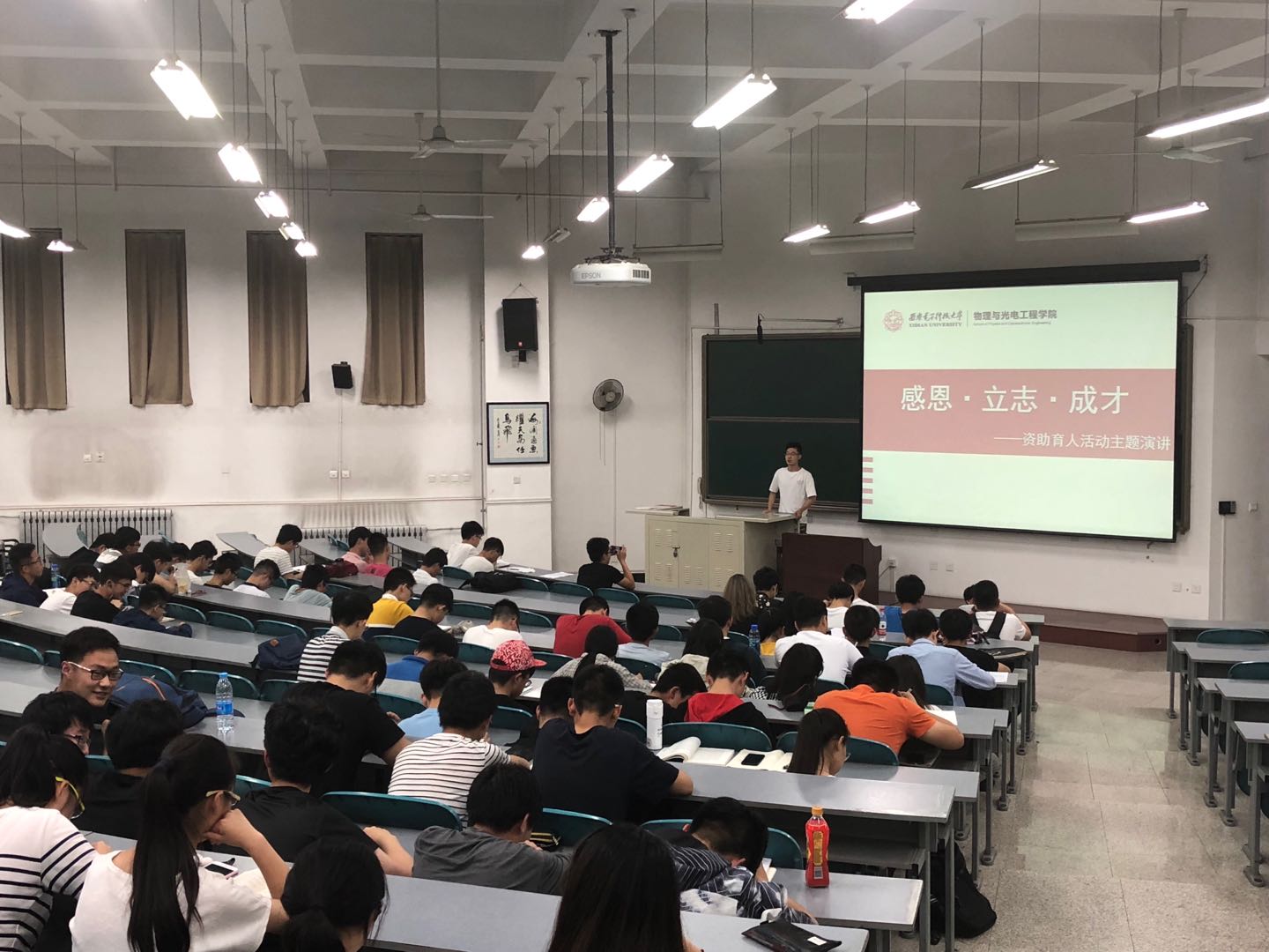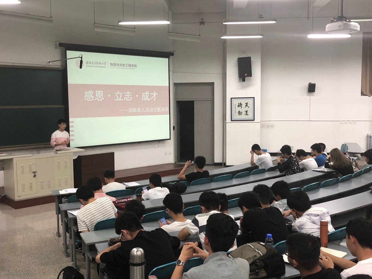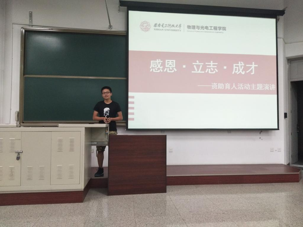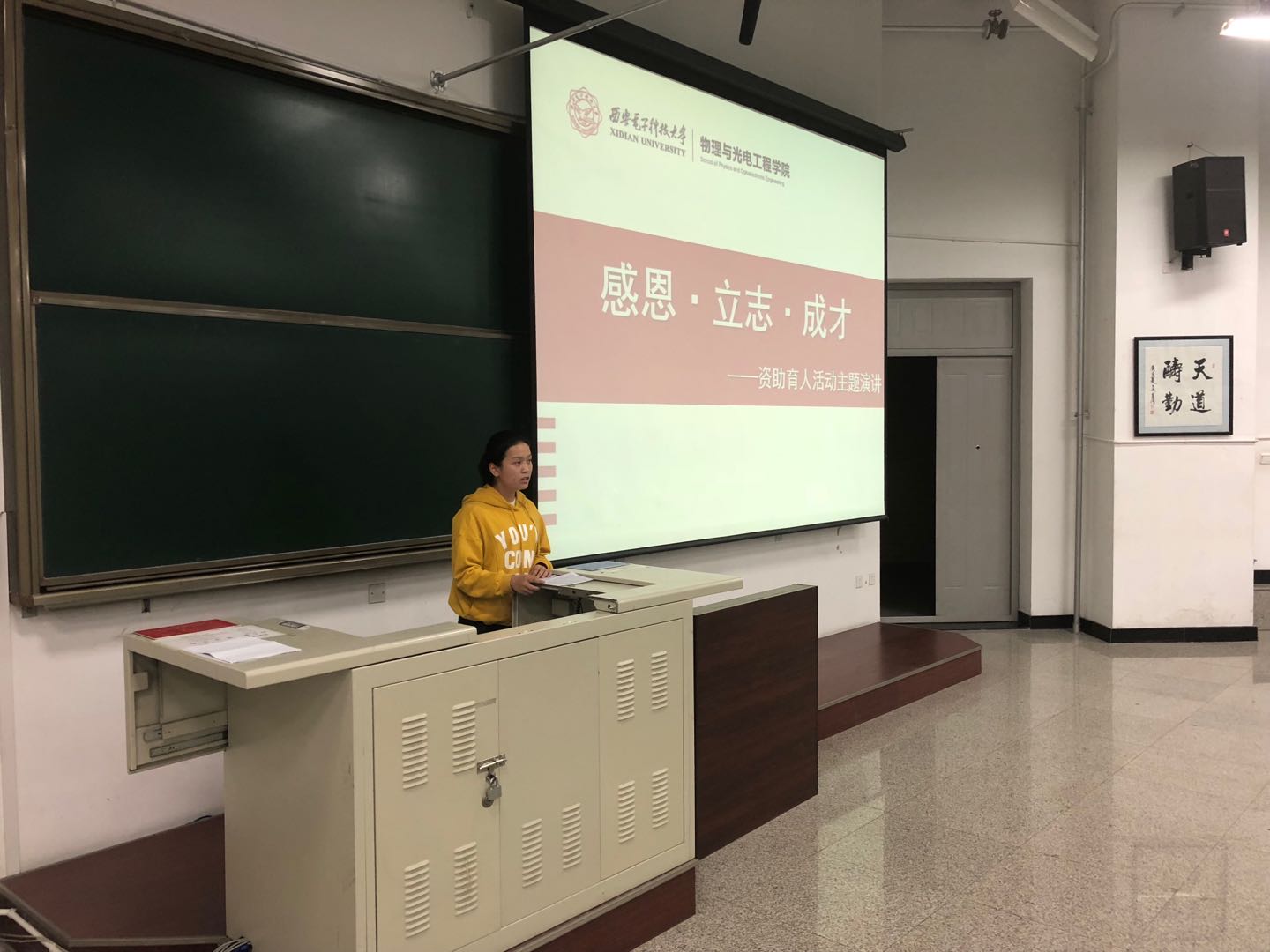 在D楼211举办了以“感恩·立志·成才”为主题的资助育人演讲活动,演讲由辅导员田宪主持,2017级全体本科生参加。