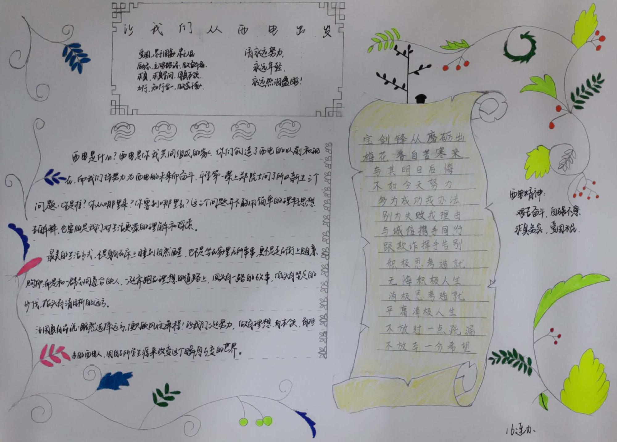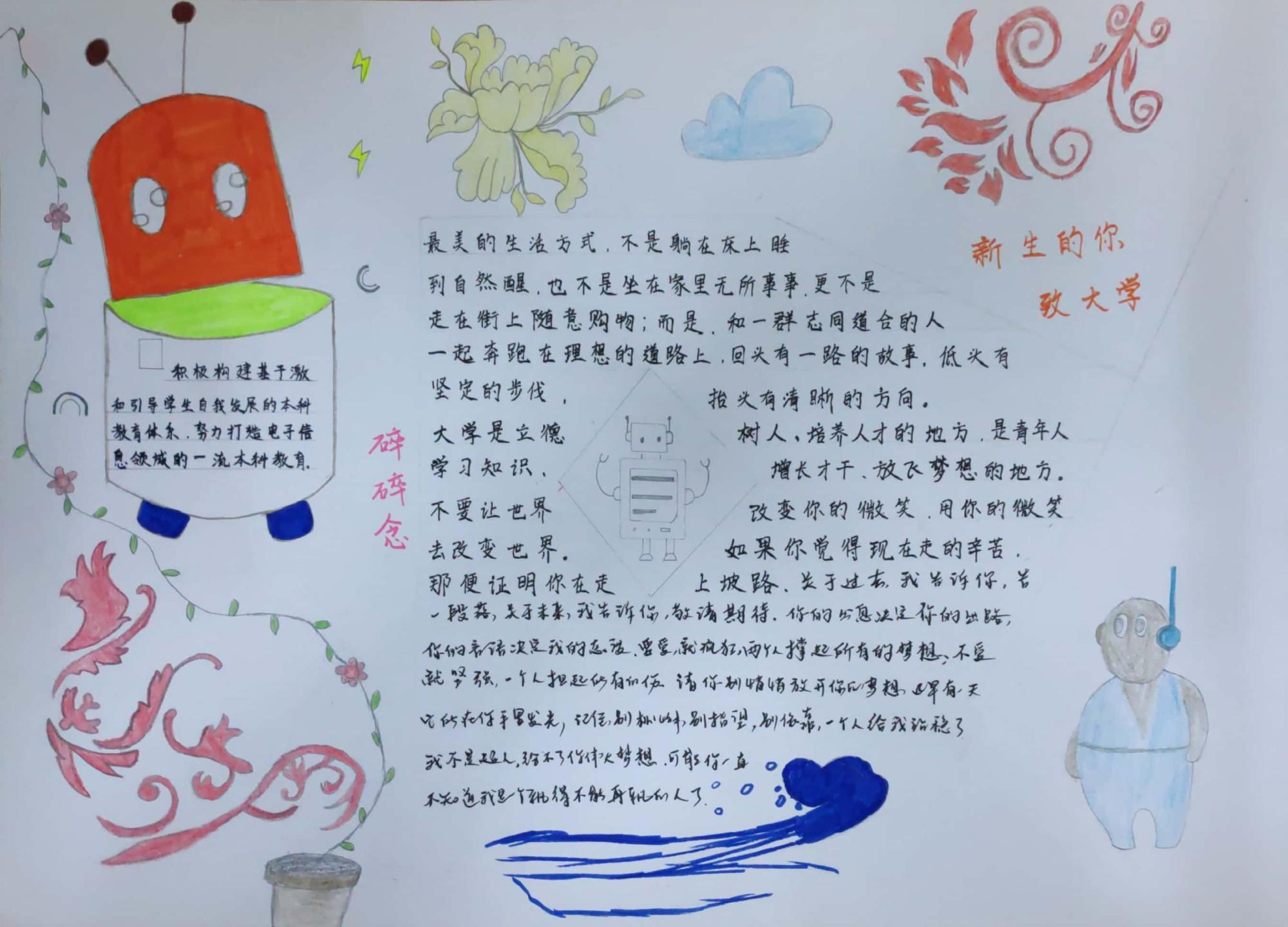 看到辅导员老师的感悟分享,同学们对开学第一课有了更深刻的认识,纷纷积极踊跃发言:高将同学表达了自己对身为金沙娱乐城人的骄傲和对未来的信心,通过开学第一课自己更加明确了未来、目标、担当与选择的关系;静一鸣同学表示感受到了金沙娱乐城的亲切感与认同感,对金沙娱乐城的大学生活充满期望;牛少波同学表现了自己身为新生代大学生的自觉以及做一名有社会历史责任和担当的新金沙娱乐城人的抱负与决心。此外,部分同学还在训练之余,通过手抄报的形式,向全体18级新生分享自己的心得与感悟。