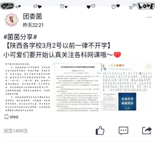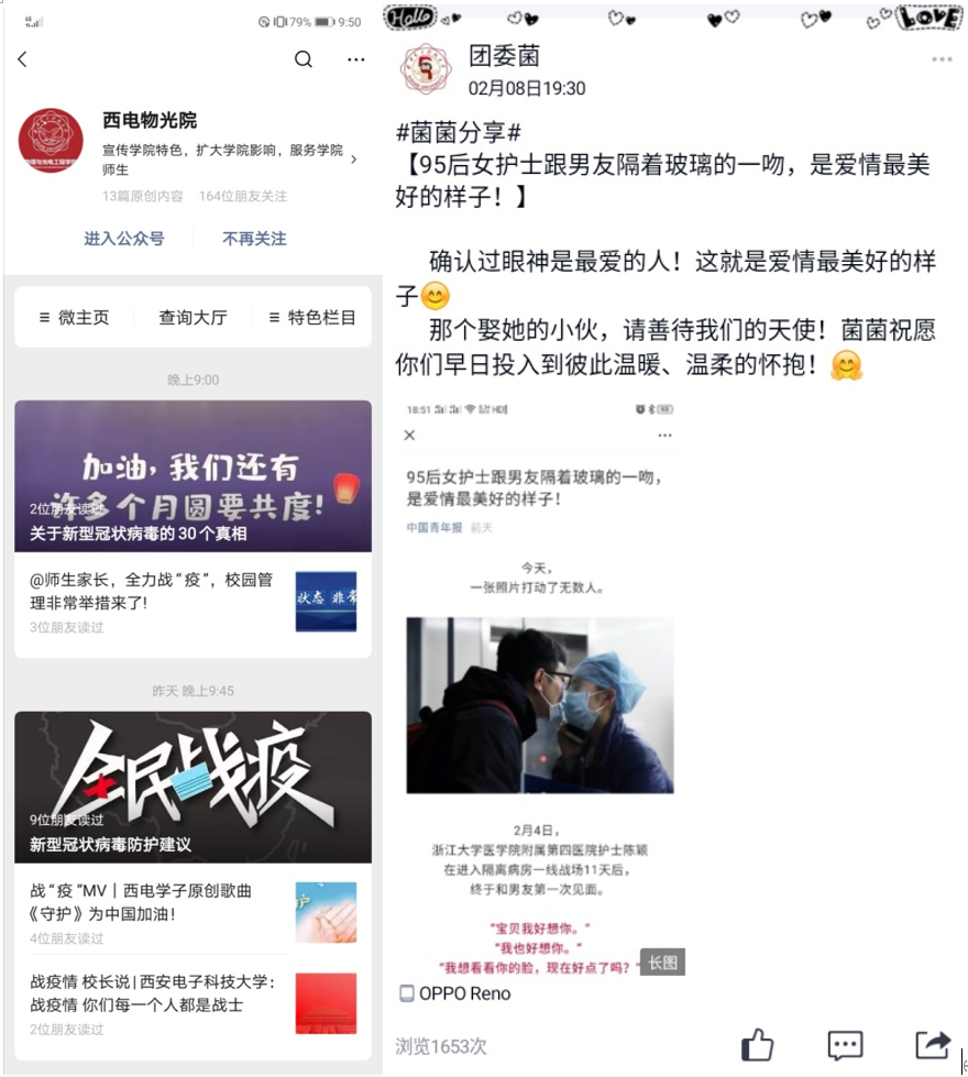 依托新媒体矩阵平台,向师生普及疫情防控方法与公共卫生安全知识,及时跟进官方讯息,破除不实谣言,与师生暖心互动,关注师生身体健康与生活状况,扶正舆论导向,传播正能量,进一步提升师生防疫知识储备与应对能力,增强科学应对疫情的信心。各班级利用网络平台开展线上主题班会,组织班级学生线上开展活动,除了开展疫情防护知识教育外,深入开展爱国主义教育、生命教育、爱与感恩教育,强化学生纪律意识和社会责任感。