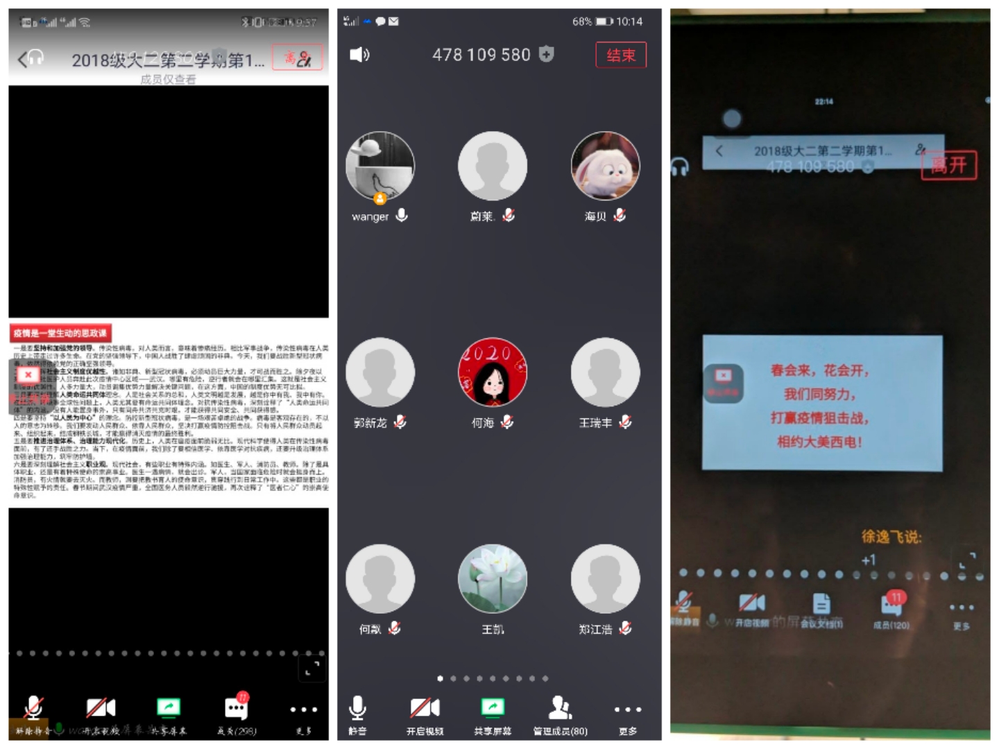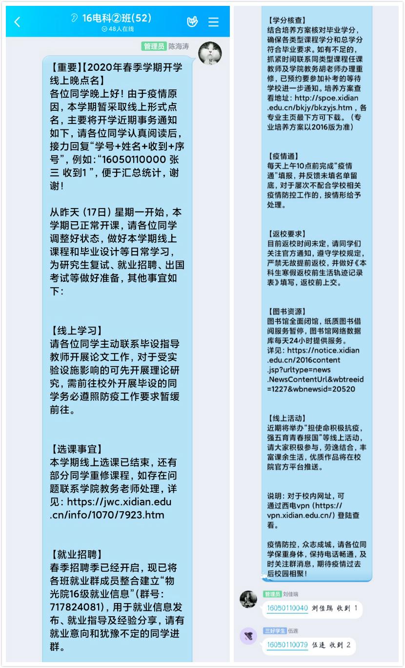 各年级通过不同平台,组织了线上“晚点名”,开展抗“疫”教育与开学动员教育工作。各年级辅导员通过分析了当前疫情形势、带来的挑战和对大家的要求,鼓励大家调整好个人状态,为新学期明确目标,完成好学业任务。2020新学期的“云”点名为大家开启了一个难以忘怀的新学期,大家也纷纷表示,开学“晚点名”后会以一个新的状态来应对这个难忘的学期。