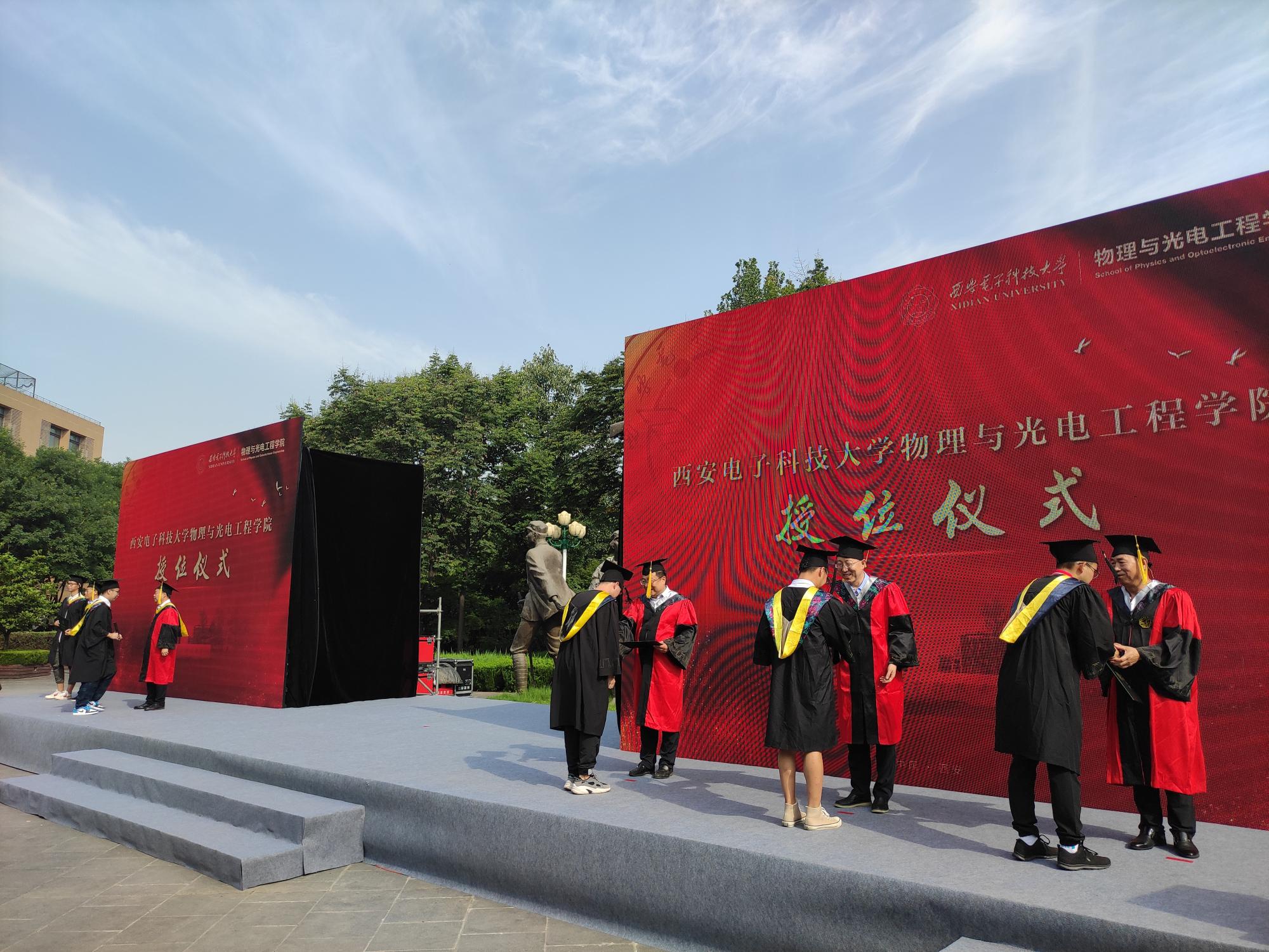 党委书记独国社、执行院长邵晓鹏、副院长魏兵、学术委员会主任郭立新、学位委员会成员李平舟共同上台,为全体毕业生拨穗授位、合影留念,为每位毕业生大学阶段学习生活画上圆满的句号。