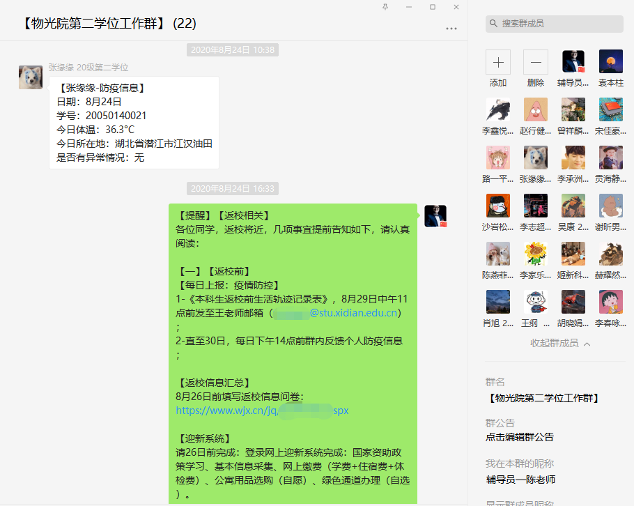 第二学士学位相关讯息通知到位,每日记录学生疫情防控信息,动态更新返校前活动轨迹,逐一前往新生所在宿舍,查看床铺准备情况;来校前,辅导员通过腾讯会议进行线上点名,将报到注意事项、疫情防控要求、新生入学体检等相关事宜进行说明,并就学生关于来校交通、公寓入住、饮食采购等问题进行解答。
