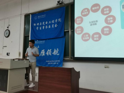 随后,2020级新生辅导员王纲老师结合2018、2019级书院建设,向领航员们介绍了这级新生所处大类招生背景下新书院建设的不同,对大类分流、转专业等相关问题进行了详细阐述。他说到,书院制是高校基于学生社区建设个性发展的一种新型教育管理制度,是顺应信息时代人才培养、高等教育改革的新要求。关于大类招生专业分流他太补充介绍了电子信息类的专业方向和发展前景,展示了金沙娱乐城