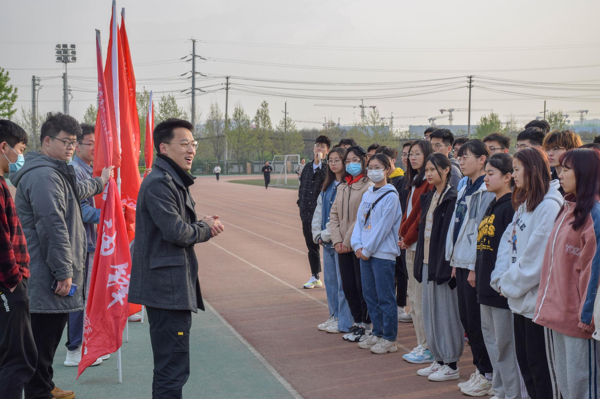 沐浴在清晨的阳光下,运动健儿们在南校区北操场主席台前集合,物光院辅导员毕力格老师及学生代表王浩宇分别进行了动员讲话、队员表态,鼓励大家积极锻炼,筹备校运会,继续发扬物光院团结、拼搏的奋斗精神,在校运会上再创佳绩。