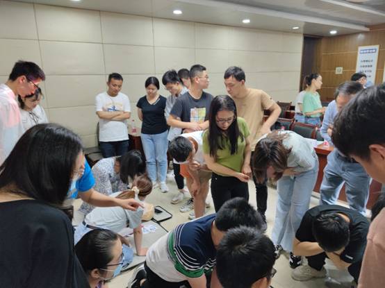 随后,培训团队分为两组,耐心、细致地对全体师生进行了手把手的实操环节练习。现场师生踊跃参加,根据培训所学知识进行了实操练习。在实操过程中,师生们对照电子检测器的反馈结果,发现实际操作仍存在许多问题,如胸部按压力度不足、人工呼吸操作不规范等,医师团队对实操中出现的问题进行解答与现场示范。经过医师的专业指导和师生的认真学习,大家都基本掌握了心肺复苏术的流程规范,表示获益匪浅,培训现场气氛热烈。