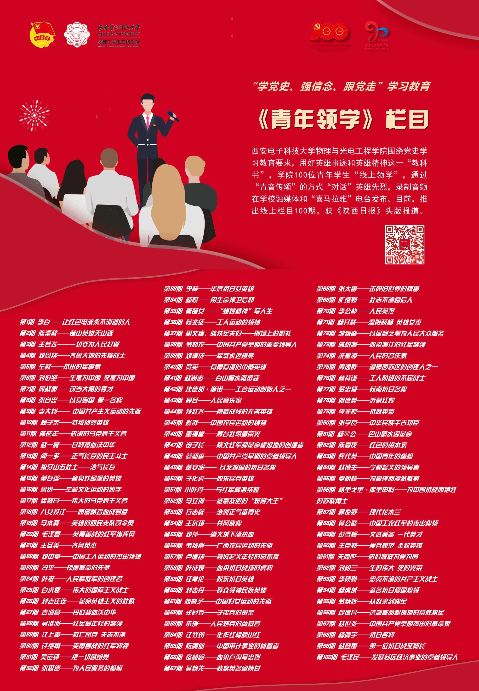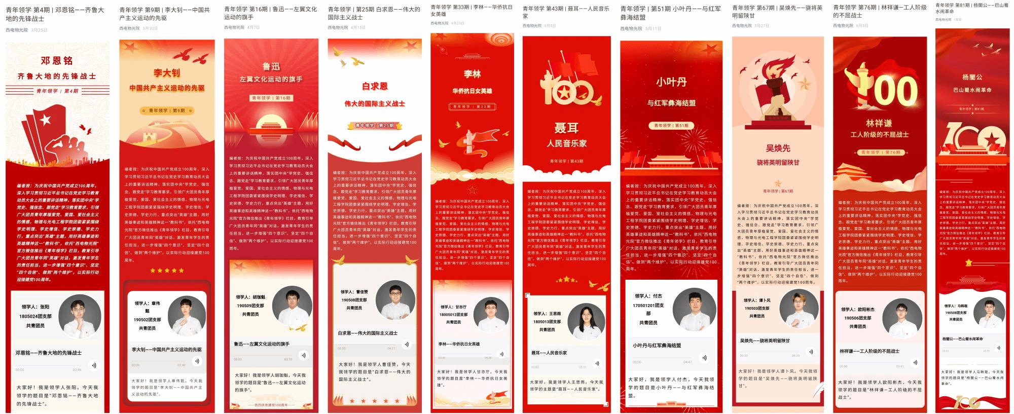 目前,“青年领学——把英雄故事讲给你听”100期线上栏目即将更新完毕,不仅包括李大钊、谢子长、刘志丹等革命先烈,还有鲁迅、聂耳、冼星海等仁人志士,以及白求恩、埃德加·斯诺、格里戈里·库里申科等国际主义战士,这些英雄故事正是坚持“立德树人”最鲜活的教科书。