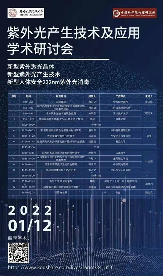 我国在新型紫外激光晶体、新型紫外光产生和新型人体安全222nm紫外光消毒等紫外光相关的领域具有世界领先的科技,不少成果也实现了转化应用。为了进一步探讨并挖掘紫外光产生技术及在灭菌杀毒、疫情防护等方面的应用,2022年1月12日,金沙娱乐城