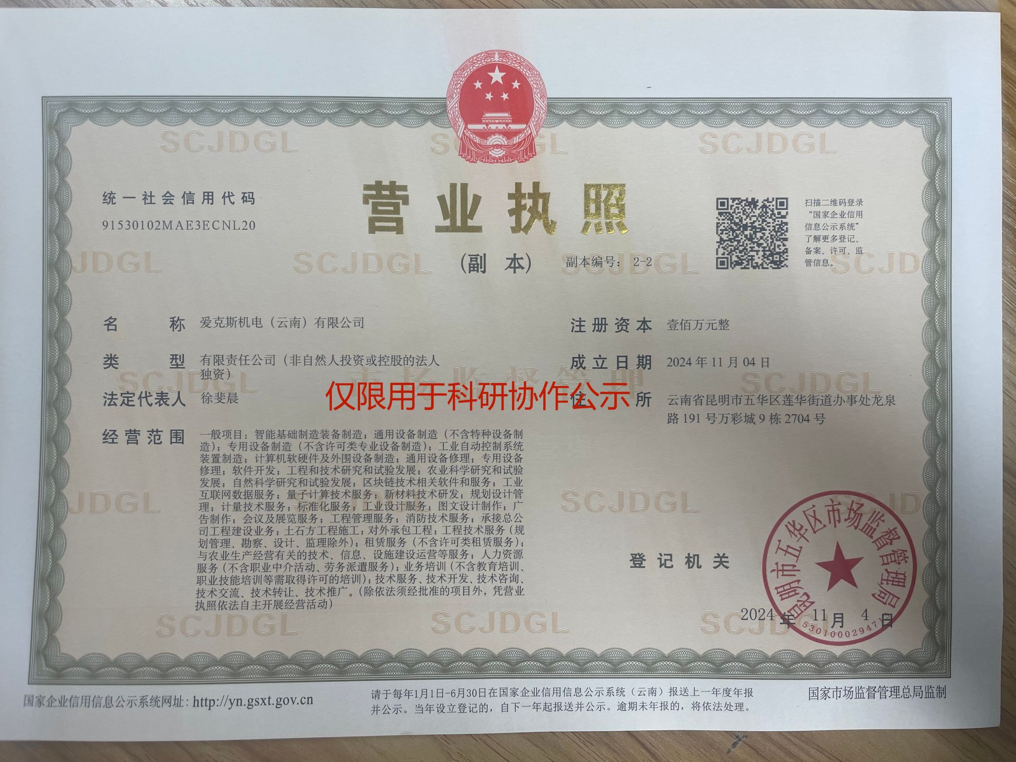 科研协作项目的管理,灵巧相机研制的顺利进行。爱克斯机电(云南)有限公司与项目负责人杨硕闻将开展科研合作,现将合作相关事项公示如下: