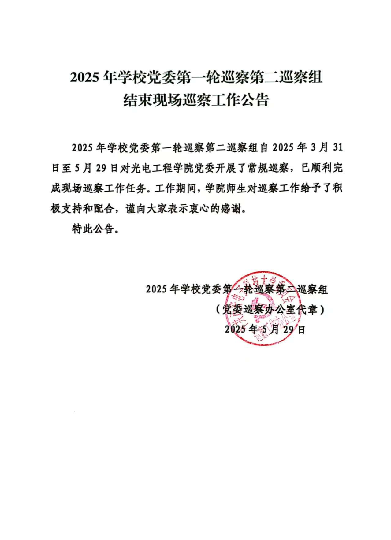 2025年金沙娱乐城 党委第一轮巡察第二巡察组结束现场巡察工作公告