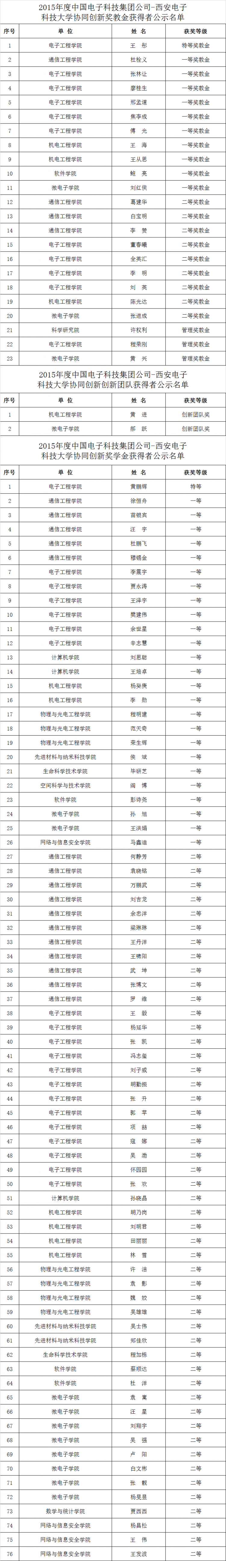 2015年度中国电子科技集团公司-金沙娱乐城 协同创新奖教金获得者公示名单