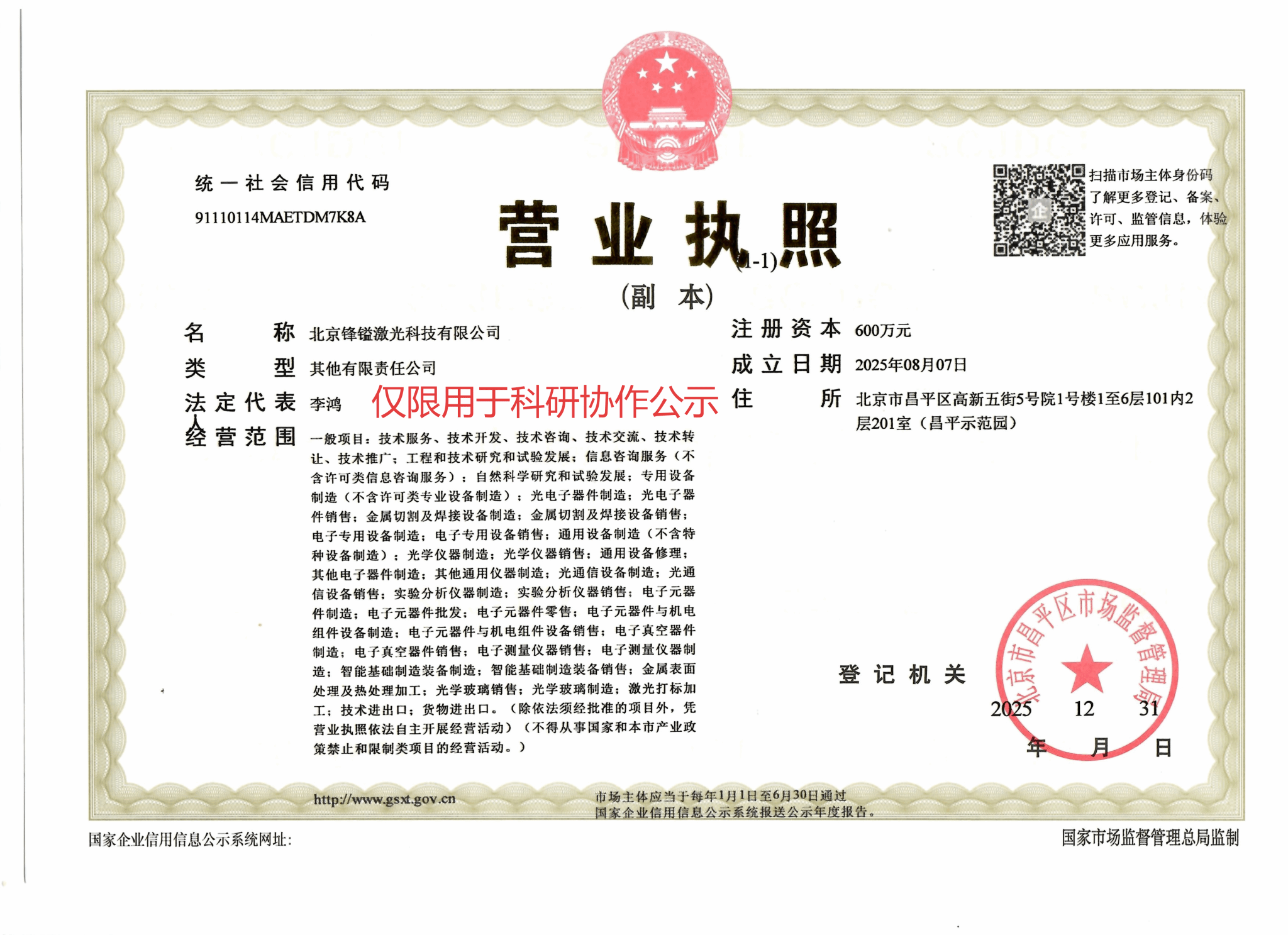 科研协作项目的管理,确保多路输出大能量飞秒激光系统工程研发的顺利进行。北京锋镒激光科技有限公司与项目负责人于洋将开展科研合作,现将合作相关事项公示如下: