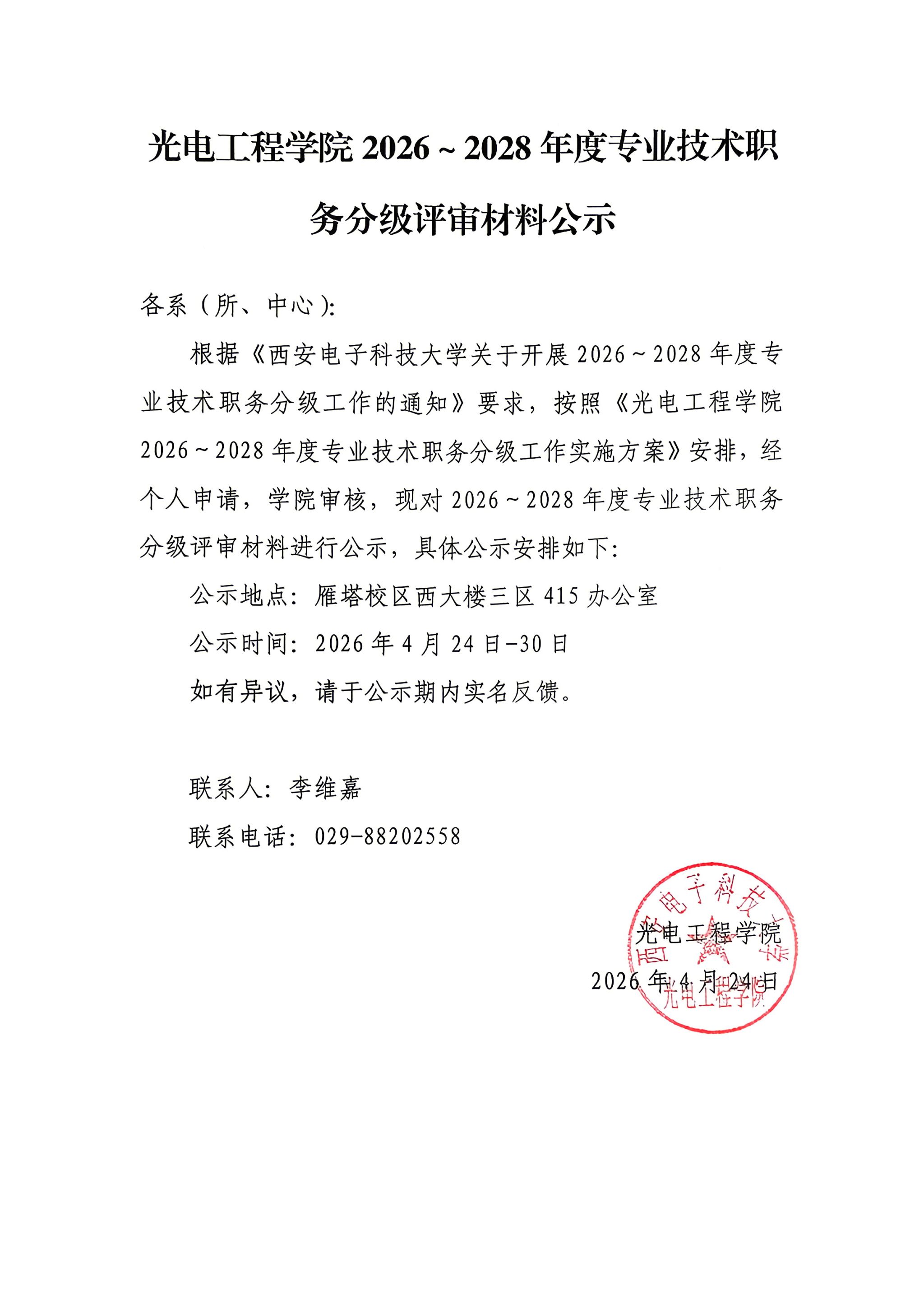 金沙娱乐城 2026~2028年度专业技术职务分级评审材料公示