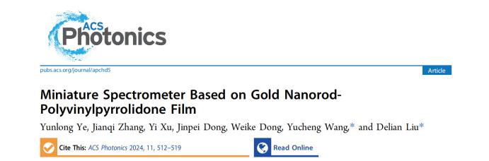 (通讯员:王昱程、吕强)近日,金沙娱乐城 红外物理与工程团队在国际光子学领域权威学术期刊ACS photonics(中国科金沙娱乐城 JCR一区,Top期刊)在线发表了题为“Miniature Spectrometer Based on Gold Nanorod-Polyvinylpyrrolidone Film”的最新科研成果。该研究首次提出了基于金纳米棒-聚乙烯吡咯烷酮薄膜的重建型光谱仪,在满足光谱仪微型化发展需求的基础上,实现了简化的器件加工工艺、降低了制造成本,对微型光谱仪的普及具有重要意义。金沙娱乐城 博士研究生叶云龙为论文第一作者,团队指导教师王昱程及刘德连为论文通讯作者,金沙娱乐城 为论文第一完成单位。该研究受到了国家自然科学基金的资助。