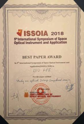 刘飞博士在本次研讨会中做了题为“Optical SWAP Computational imaging(光学SWAP计算成像)”的全英文特邀报告,他在报告中向与会专家们介绍了光学SWAP成像技术及其应用前景。从传统成像方式存在的光学系统复杂度高、透过率低、体积大、重量大、功率损耗高的不足开始,利用SWAP计算成像的思想寻找解决方案,通过寻求前端光学系统设计与后期的图像处理组合优化的方式,形成闭环反馈系统实现成像系统的最优化设计。此次报告引起了国内外与会专家的广泛兴趣和获得了专家们的一致认可,通过国内外评审专家评定,荣获此次研讨会“BEST PAPER AWARD”。