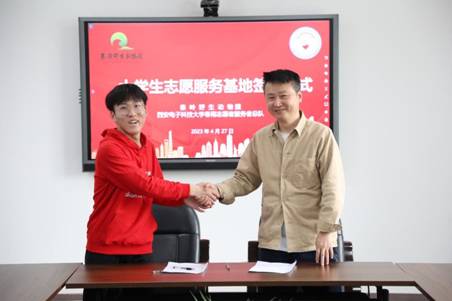 春雨志愿者服务队与秦岭野生动物园举行大学生志愿服务基地签约仪式。秦岭野生动物园党委副书记马晓丽、人事部部长张耀峰、市场发展部部长刘钢,春雨志愿者服务队指导老师王纲及春雨志愿者服务队总队长张熠等3名志愿者代表参加签约仪式。
