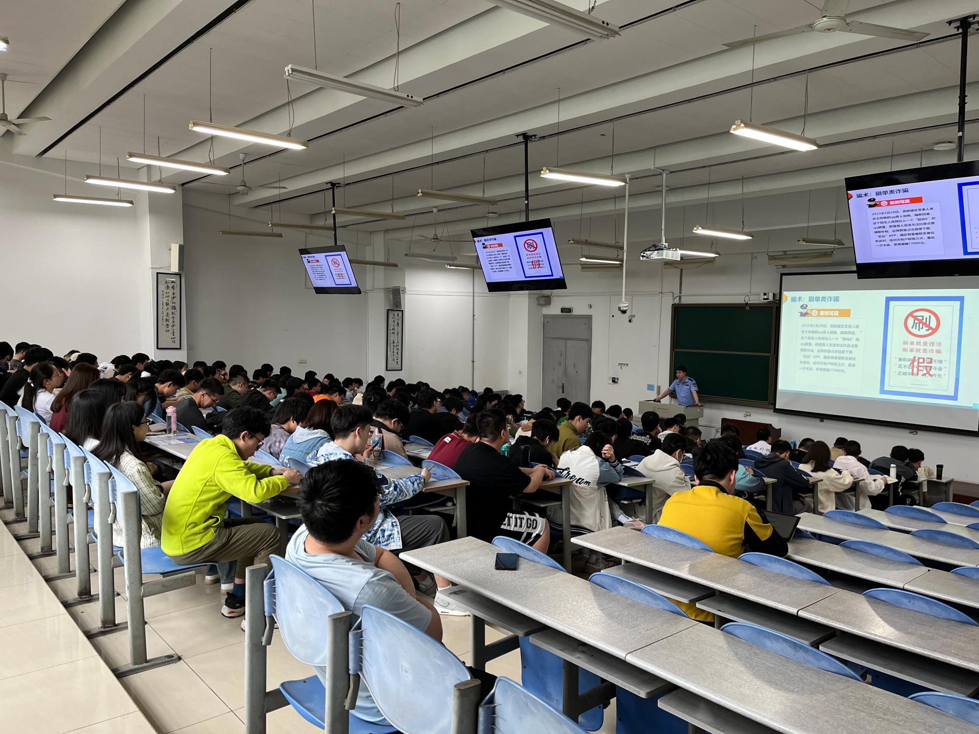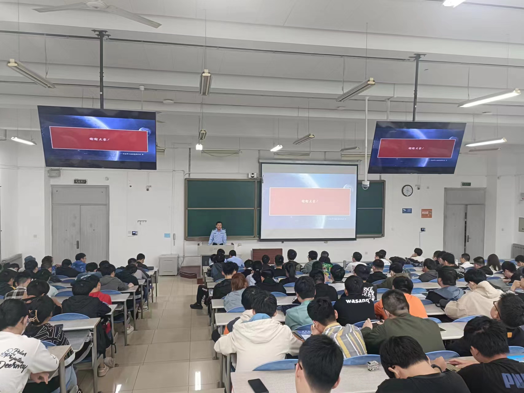 在B434教室开展反电信诈骗专题讲座,西安市公安局高新分局杨皓宇、潘志勇、黄航三位警官及金沙娱乐城