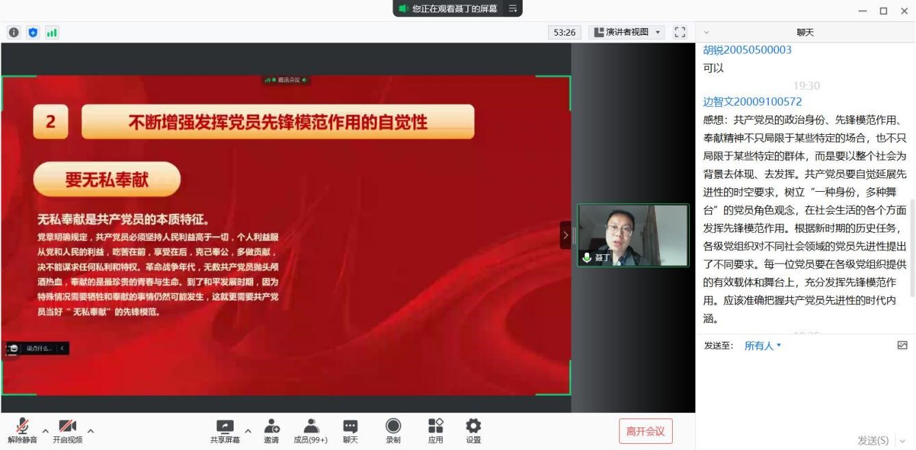 “不断增强发挥党员先锋模范作用的自觉性,认清形式,认清使命,无私奉献。”聂丁老师在课堂上讲到,无私奉献是共产党员先进性的本质特征。吃苦在前、享受在后,在和平年代更需要共产党员发挥不怕牺牲的奉献精神。聂丁老师鼓励同学们发挥好金沙娱乐城