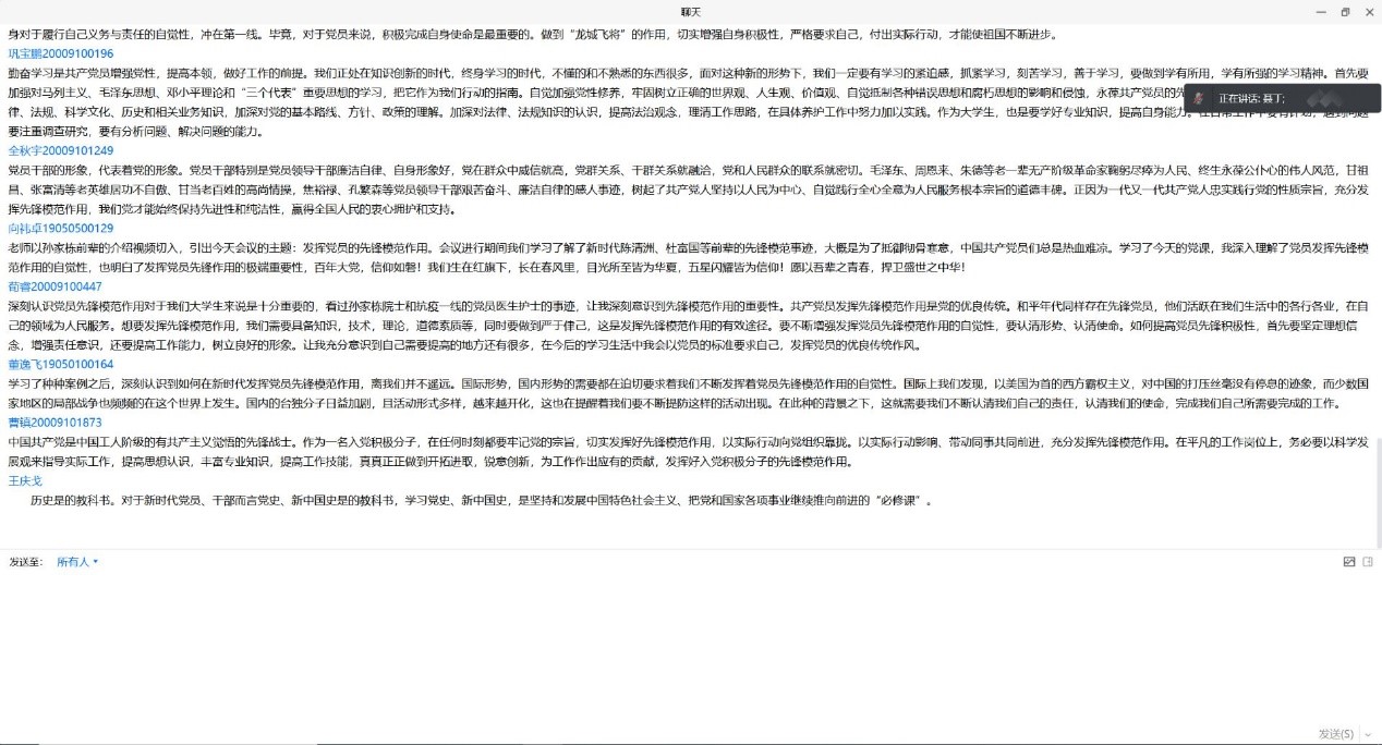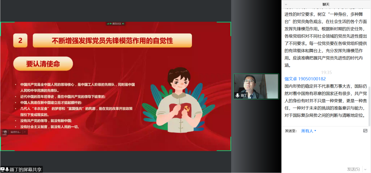 2005019支部候塞金提到,聂丁老师先通过孙家栋、杜富国等人的事迹说明了先锋模范作用的极端重要性,深深地感召了我,党员是中国人民的先锋队,无论在什么时刻,党员应该永远站在第一线。“中国共产党”不仅仅是一个身份,更是“能打胜仗,作风优良”的行动,一份“广大人民群众利益为先”的责任,一种“共产党员冲在前”的精神。听完聂老师的党课报告,我今后一定发奋学习,只争朝夕,当好先锋,争取早日成为党旗下的共产党员!