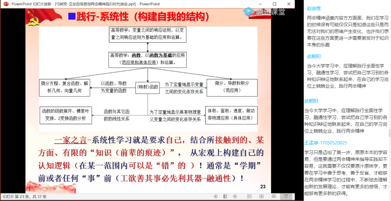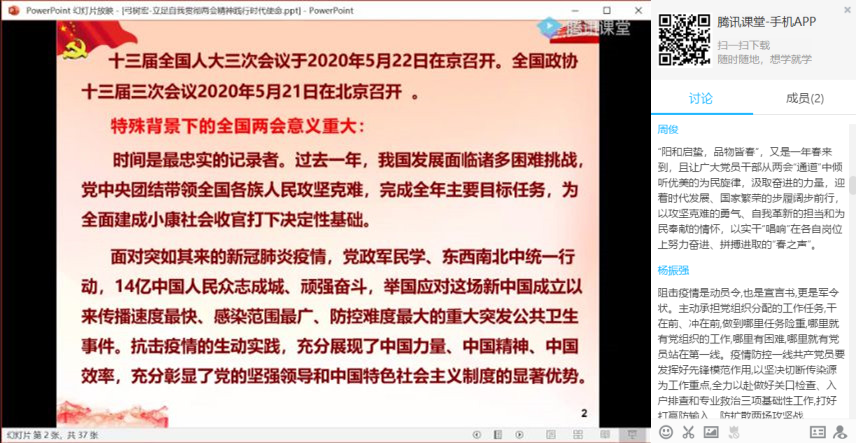 第十四期中级党校第三次党课在腾讯课堂平台开讲。本次党课由教师党支部书记弓树宏主讲,题目为《立足自我,立足现在,贯彻两会精神,践行时代使命》。共40余名学员参加本次党课。