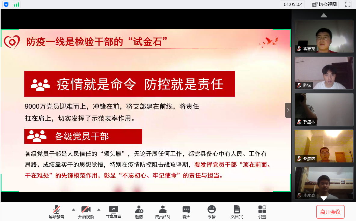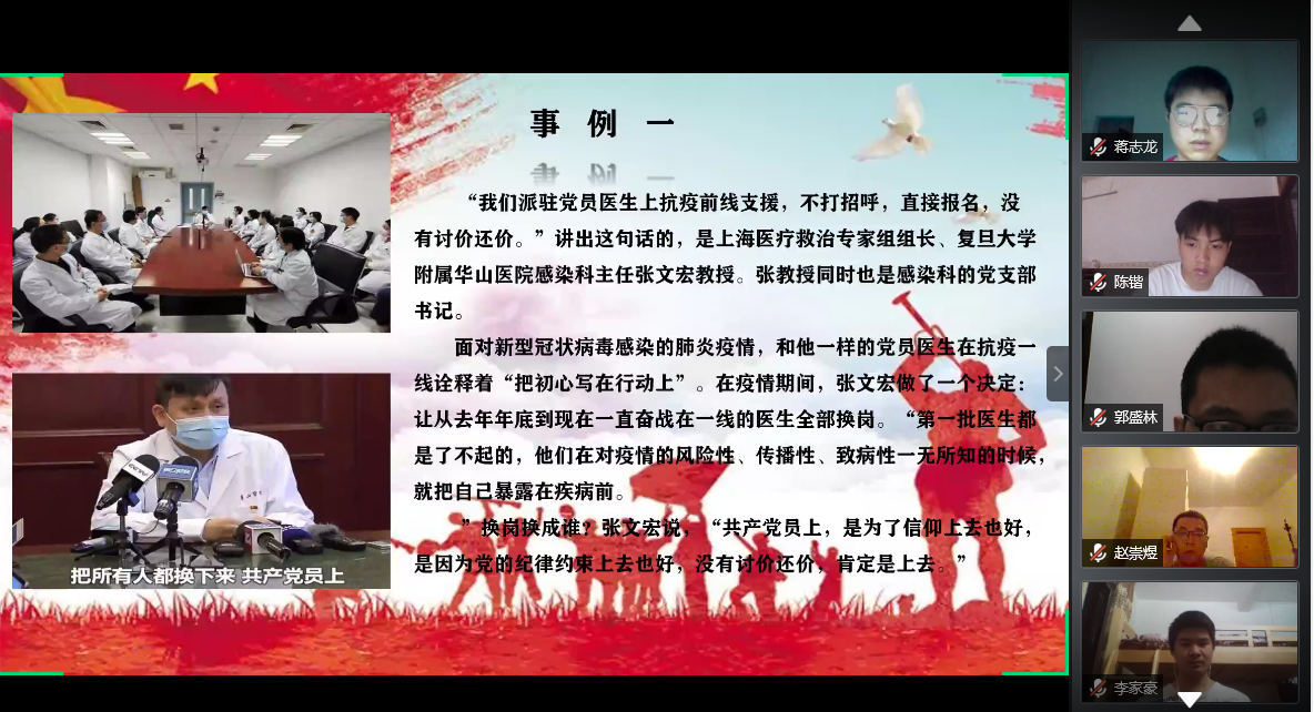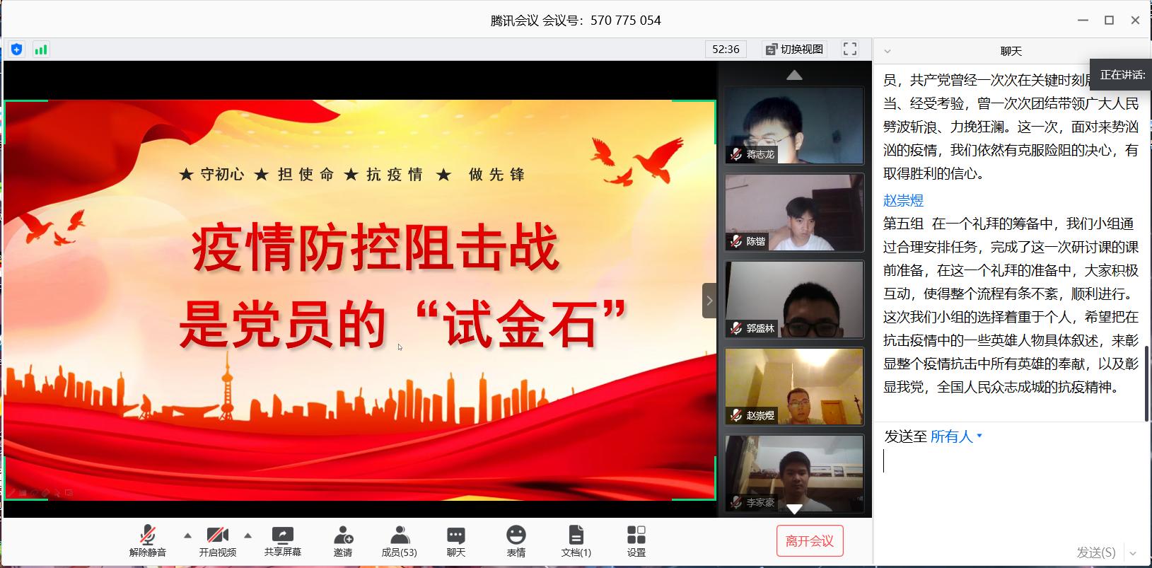 团委组织部干事云田说明了本次研讨课的主题、议程以及注意事项。本次研讨课以“疫情防控践初心,党员先行担使命”为主题。疫情当前,我们看到无数驰援武汉、无私奉献的身影,他们拥有一个共同的名字——中国共产党员。他们像黑暗中的火烛,照亮了前进的方向。同学们根据预先分组,围绕“疫情期间先进党员事迹”“全民抗疫,党员先行”“抗击疫情,与党同行”等主题,通过共享屏幕PPT的形式向大家分享研讨内容与学习心得。