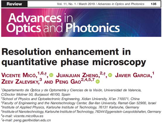 (通讯员:郜鹏)近日,Advances in Optics and Photonics (AOP)刊登了金沙娱乐城物光院郑娟娟博士与西班牙Valencia大学Mico教授一起受邀撰写的长篇综述文章“Resolution Enhancement in Quantitative Phase Microscopy”(80页)。Advances in Optics and Photonics (AOP)是美国光学学会下的旗舰期刊(属SCI/EI检索、物理类I区,影响因子:21.28),该期刊旨在系统报道光学、光子学领域内的科学与技术上的重大进展。定量相位显微...
